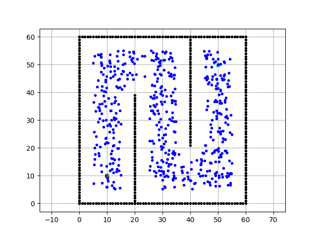 This PRM planner uses Dijkstra method for graph search. In the animation, blue points are sampled points, Cyan crosses means searched points with Dijkstra method. The red line is the final path of PRM.