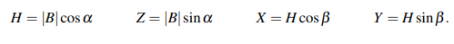 마지막으로 우리는 자기장 벡터의 수평장 강도 (H), 위도 (X), 세로 (Y) 및 수직장 (Z) 성분을 계산할 수 있다.
