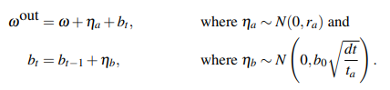 자이로스코프와 가속도계는 IMU를 구성한다. 우리는 백색 소음과 시간 경과에 따른 편향 표류를 추가하여 모델링하였다.