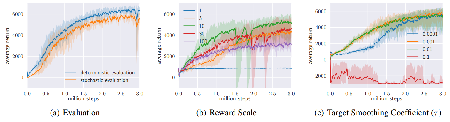 Policy evaluation. SAC는 stochastic policy로 수렴하기 때문에 최상의 성능을 만드는 최종 정책 선정에 도움을 준다. 평가를 위해 정책 분포의 평균을 근사하였다. 위 그래프에서 (a)를 보면 deterministic이 stochastic보다 좋은 성능을 보여준다.