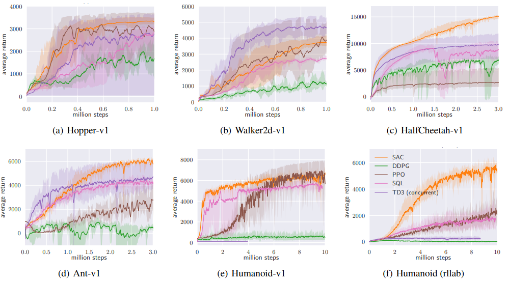 전반적으로 SAC의 성능이 좋은 것을 위의 그래프를 통해서 알수있다. DDPG는 ant와 Humanoid(e와 f)모두 좋은 성적을 보이지 못했다. SAC는 PPO보다 빠르게 학습했는데 이것은 PPO가 복잡한 태스크에서 batch size가 크기 때문에 나타난 결과이다. SQL은 모든 태스크를 성공했지만 SAC보다 학습 속도도 느리고 성능도 조금씩 떨어진다.