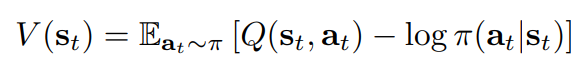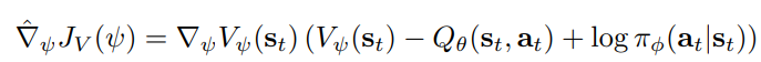 State-Value Function은 Soft-Value를 근사한다. 위 식은 Q-함수 및 정책과 관련되므로, 원칙적으로 State Value 별도의 함수 근사기를 포함할 필요가 없지만 실제로는 Soft Value에 대한 별도의 함수 근사기를 포함하면 훈련을 안정화시킬 수 있으며 다른 네트워크와 동시에 훈련하는 데 편리하다. Soft Value function는 잔차 오차 제곱을 최소화하도록 학습한다.