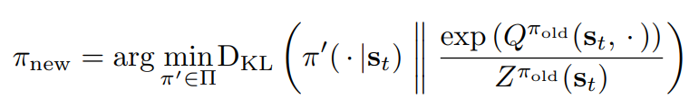 정책 개선 단계에서 우리는 새로운 Q-함수의 지수화를 위해 정책을 업데이트한다. 이러한 특정 업데이트 선택은 소프트 Value 측면에서 개선된 정책을 가져올 수 있음을 보장할 수 있다. 원칙적으로 우리는 어떤 예측이든 선택할 수 있지만, 쿨백-라이블러 발산 측면에서 정의된 정보 예측을 사용하는 것이 편리하다. 즉, 정책 개선 단계에서 각 상태에 대해 다음과 같이 정책을 업데이트합니다.