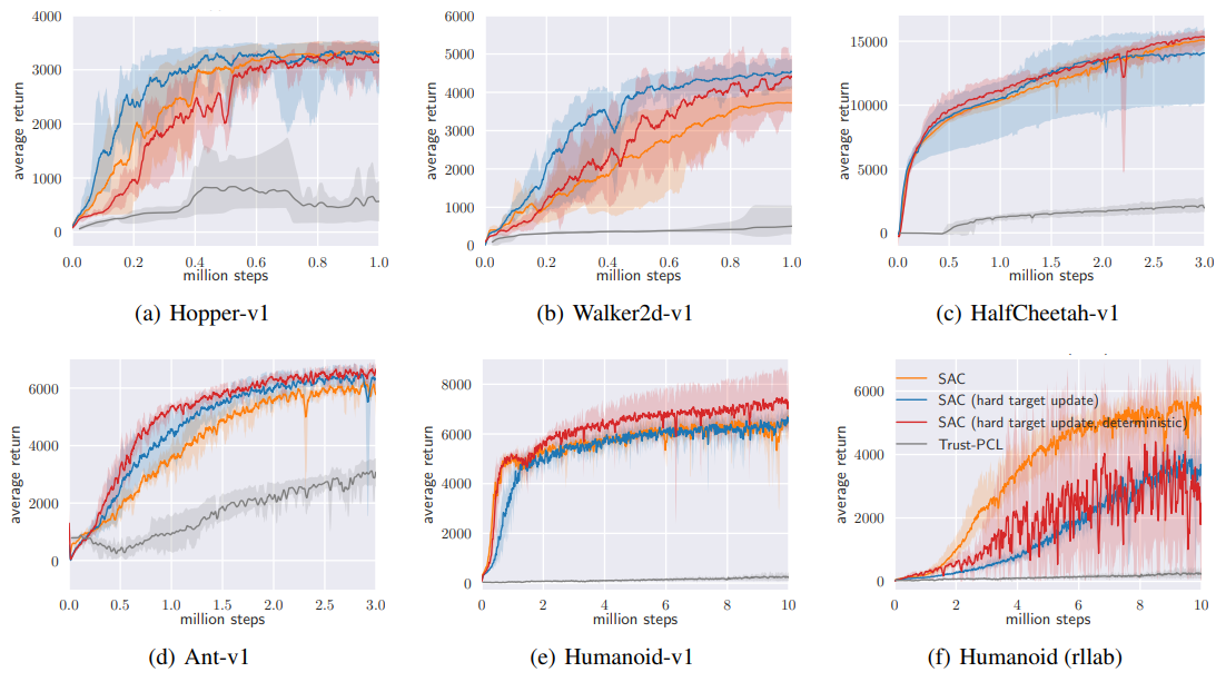 전반적으로 SAC의 성능이 좋은 것을 위의 그래프를 통해서 알수있다. DDPG는 ant와 Humanoid(e와 f)모두 좋은 성적을 보이지 못했다. SAC는 PPO보다 빠르게 학습했는데 이것은 PPO가 복잡한 태스크에서 batch size가 크기 때문에 나타난 결과이다. SQL은 모든 태스크를 성공했지만 SAC보다 학습 속도도 느리고 성능도 조금씩 떨어진다.