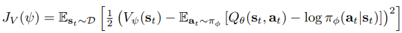 State-Value Function은 Soft-Value를 근사한다. 위 식은 Q-함수 및 정책과 관련되므로, 원칙적으로 State Value 별도의 함수 근사기를 포함할 필요가 없지만 실제로는 Soft Value에 대한 별도의 함수 근사기를 포함하면 훈련을 안정화시킬 수 있으며 다른 네트워크와 동시에 훈련하는 데 편리하다. Soft Value function는 잔차 오차 제곱을 최소화하도록 학습한다.