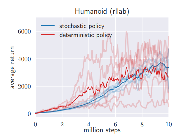 두 곡선을 보면 stability 차이를 확인할 수 있다. stochastic이 더 안정된 모습. 어려운 태스크 일수록 학습 안정성은 중요해진다.