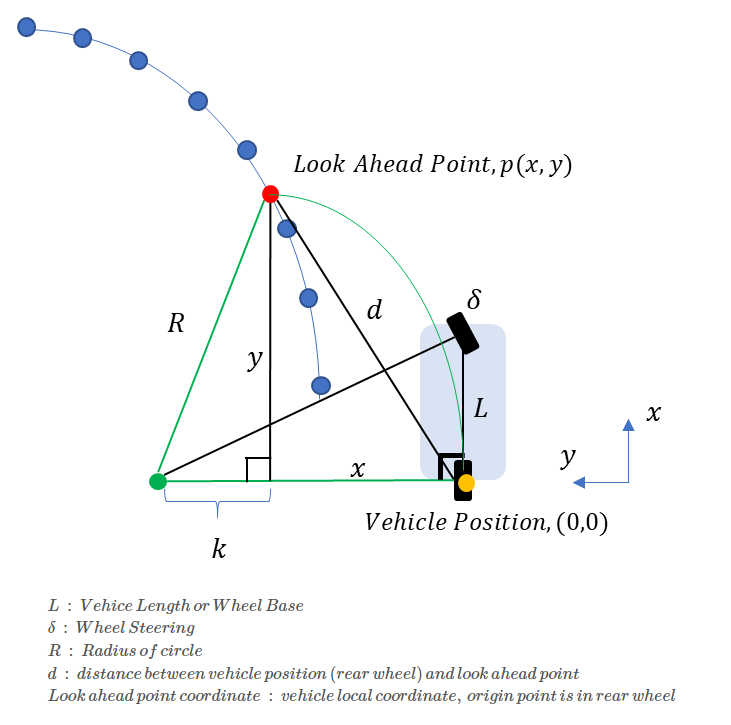Pure Pursuit 알고리즘의 핵심은 차량의 뒷바퀴가 Look Ahead Point에 도달하는 것이다.