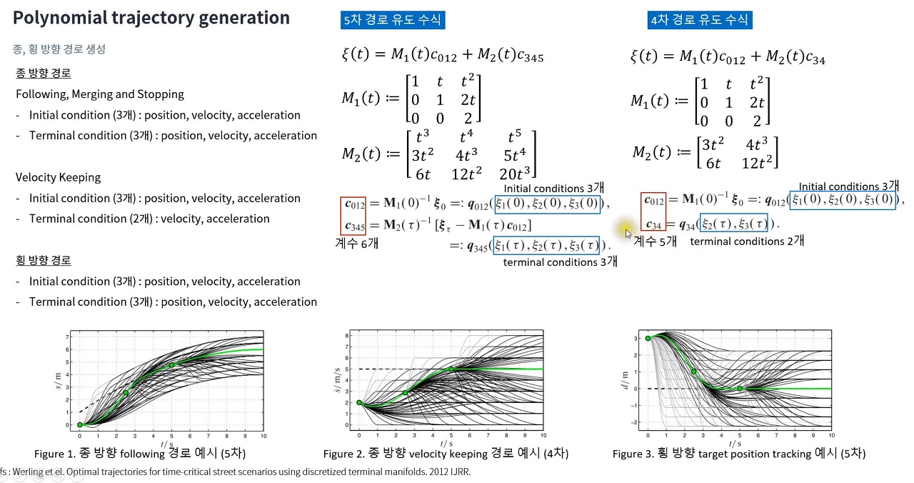 - 횡방향, 종방향 : initial value $x_i, v_i, a_i$와 target value $x_f, v_f, a_f$와 target time T로 5차 다항식 계산