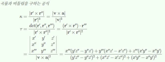 변수 t에 대한 미분으로 곡률과 비틀림을 구하는 공식을 알아두어야 한다.