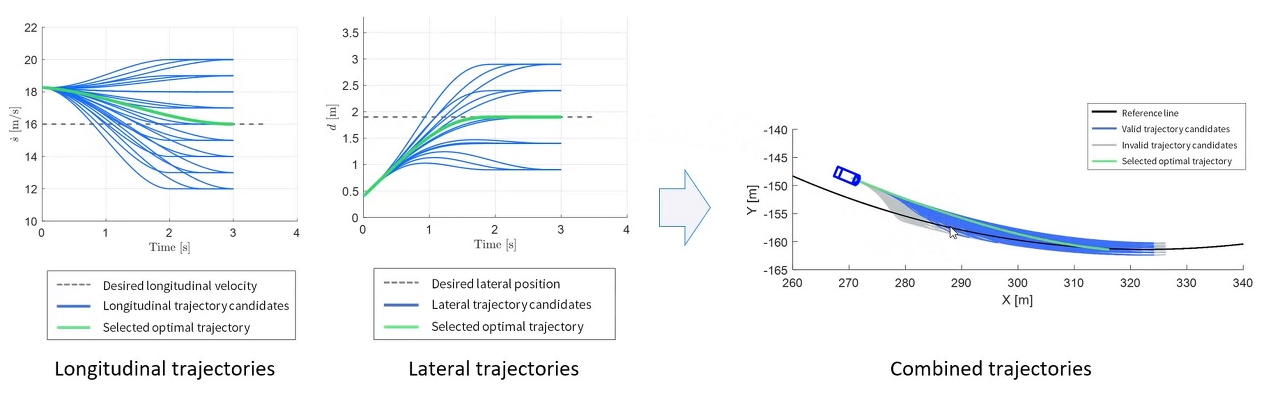 - 횡방향, 종방향 : initial value $x_i, v_i, a_i$와 target value $x_f, v_f, a_f$와 target time T로 5차 다항식 계산