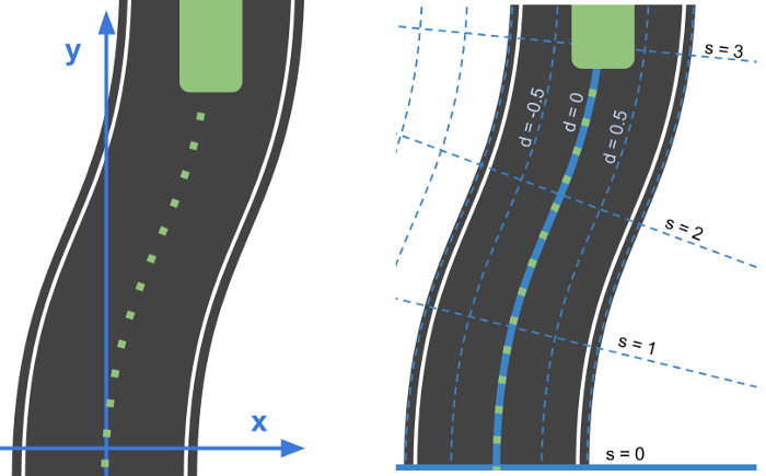 자율주행 Planning에 대해서 공부하던 중 Frenet Frame과 이를 이용한 Planning 알고리즘에 대해 정리해보고자 한다. 해당 Frame은 도로 형상의 방향으로 s-axis 가 도로와 수직방향으로 d-axis가 펼쳐져서 작관적이고 편리하다는 장점이 있다.