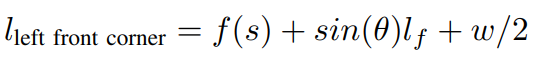 Boundary constraint가 convex, linear를 유지하기 위해 ego 차량에 두 반원을 추가한다. front-ro-rear distance는 $l_f$로 표기하고 차량의 너비는 $w$로 표기한다. 그러면 차량의 좌측 위치를 다음과 같이 표현할 수 있다.