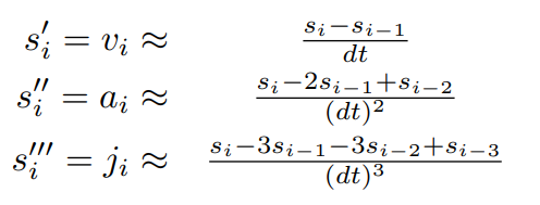 속도, 가속도, Jerk는 다음과 같은 수식을 이용하여 추정한다.
