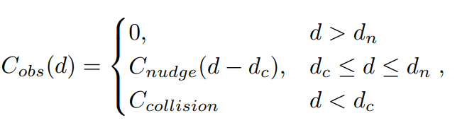 Cost Function은 다음과 같다. Reference 속도(도로의 속도 제한)와 ego 속도의 차이, 가속도의 제곱, Jerk의 제곱, 장애물에 대한 Cost(장애물과의 거리)로 이루어져 있다.