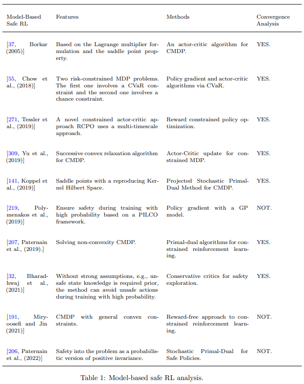 - Model-Based Safe Reinforcement Learning: Model-based DRLs have better learning efficiency than Model-free DRLs, and there are many scenarios where DRL methods such as robotics traffic planning can be applied.