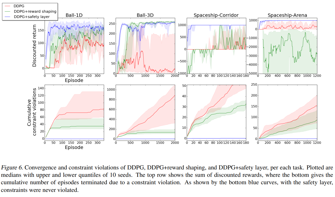 The most prominent insight from Fig. 6 is that the constraints were never violated with the safety layer. This is true for all 10 seeds of each of the four tasks. Secondly, the safety layer dramatically expedited convergence. For Spaceship, it is, in fact, the only algorithm that enabled convergence. In contrast, without the safety layer, a significant amount of episodes ended with a constraint violation and convergence was often not attained. This is due to the nature of our tasks: frequent episode terminations upon boundary crossing impede the learning process in our sparse reward environments. However, with the safety layer, these terminations never occur, allowing the agent to maneuver as if there were no boundaries.
