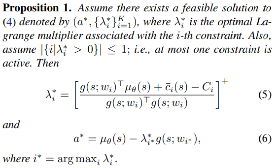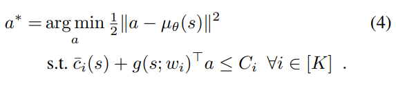 The solution (6) is essentially a linear projection of the original action to the "safe" hyperplane with slope $g(s;w_i *)$ and intercept $\bar{c_i}*(s) - C_i *$