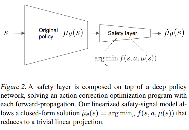 - This paper is based on learning the policy in presence of hard constraints i.e the constraints should never be violated. In this work, they directly add to the policy a safety layer that analytically solves an action correction formulation per each state. This method largely builds upon the work of OptLayer by T.H.Pham et al.