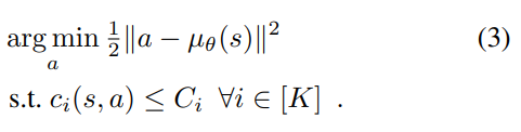 The solution (6) is essentially a linear projection of the original action to the "safe" hyperplane with slope $g(s;w_i *)$ and intercept $\bar{c_i}*(s) - C_i *$