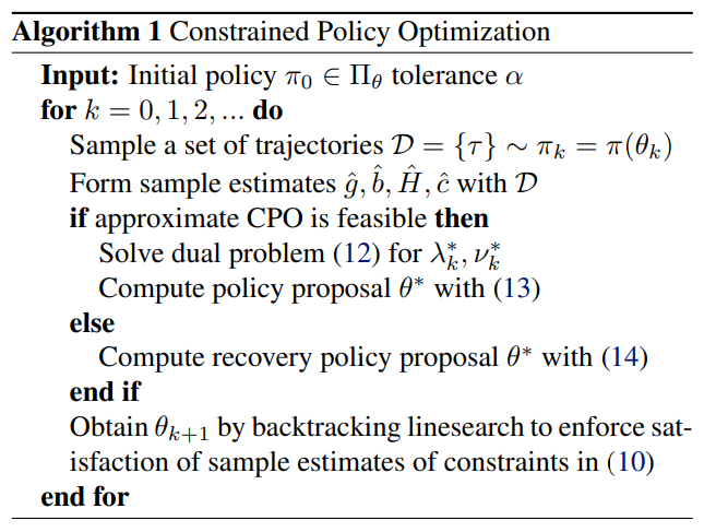 - We propose Constrained Policy Optimization (CPO), the first general-purpose policy search algorithm for constrained reinforcement learning with guarantees for near-constraint satisfaction at each iteration.