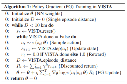 에이전트가 단순히 인간 운전자의 행동을 모방하는 방법을 배우는 지도 학습과 비교하여, 시뮬레이션의 RL은 에이전트가 특정 상황에서 총 보상을 최대화하는 적절한 행동을 학습할 수 있도록 한다. 따라서, 그 에이전트는 그 상황에서 인간이 어떻게 운전했는지 알지 못하고 에이전트는 자체 정책을 최적화하여(Algorithm 1) 더 먼 거리를 주행하는 방법을 배운다.