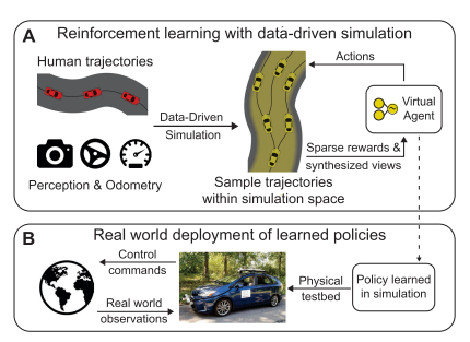 환경을 통해 사람이 수집한 실제 이동 경로를 활용하여 가상 에이전트가 운전할 수 있도록 하는 새로운 Train Data를 렌더링
