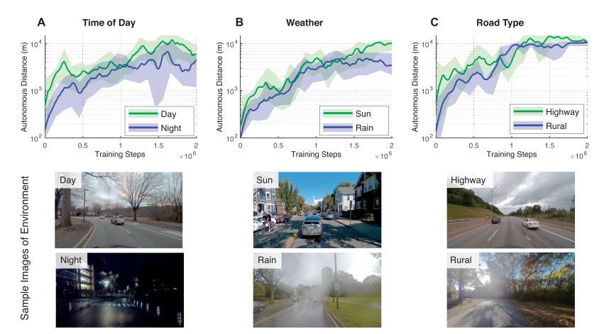 - 도시의 도로를 시골의 도로보다 훨씬 빠르게 학습한다는 것(시골 도로에는 차선 표시가 없는 시각적 특징이 학습을 어렵게 만듦)
